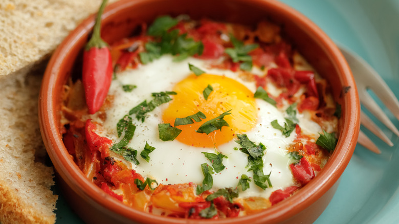 Apart from its history and the cultural references of its name, huevos a la flamenca is an ever-evolving and versatile dish prepared in traditional cazuelas — or clay pots. The common denominator of eggs flamenco is a spicy pepper, tomato, and onion foundation to crack an egg over, but additional ingredients and cooking methods change from region to region. Thought of as a humble, versatile dish, eggs flamenco is a household staple that uses whatever proteins, seasonings, and veggies you have on hand.