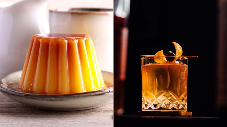 Flan has a sweet and eggy flavor, in addition to its obvious notes caramel courtesy of the sauce. Old fashioned cocktails are deceptively simple, containing within the sugar, bitters, water, and whiskey a subtle vanilla and caramel undertone. "An old fashioned has flavors of caramelized sugars that are lovely with flan," according to Amelia Jacobsen. The strong quaff cuts through the sticky sweetness of flan, and its more nuanced flavors complement the classic caramel custard. Use marshmallows for a secretly easy at-home flan, while this cocktail recipe offers an intriguing take on an old fashioned to kickstart your boozy flan pairing.