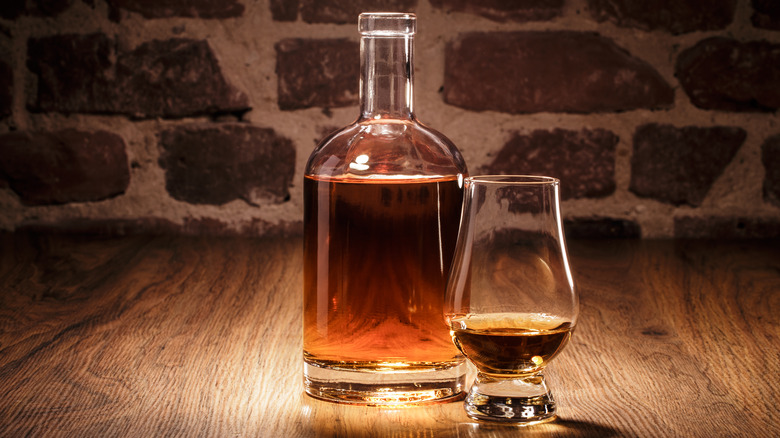 The key to picking a whiskey for this purpose is to reach for a mid-tier brand of bourbon. Many bourbons have flavor notes of vanilla, caramel, or nuts, making it the perfect choice for integrating into a dessert. You don't want to buy one that is super cheap — in other words, something that you wouldn't enjoy on its own — because the flavor of the whiskey is going to be prominent in the sauce, especially if you make the two-ingredient version. Plus, you won't be using up much whiskey — the two-ingredient sauce calls for a cup and a half for every pound of brown sugar, while other recipes may call for as little as 1 or 2 tablespoons per quarter to a half cup of sugar.