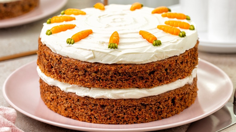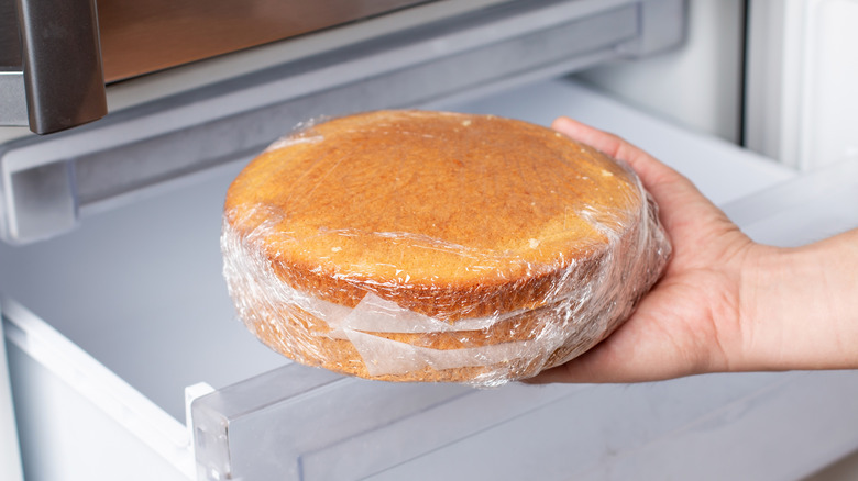 Note that, while frosting is known to shield the cake from some moisture loss, it's still better to cover your cake before placing it in the fridge to avoid odor absorption or contamination from other items. To do this without ruining your beautiful decoration, you can use a cake dome or improvise by placing the cake on a plate and inverting a bowl over it, then wrapping the whole setup with plastic wrap. But if you really want your carrot cake to last as long as possible, you'll need to freeze it.