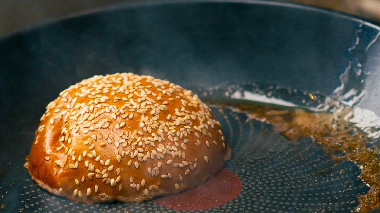 Chef Aaron underscores the necessity of bun toasting, "If time permits, this is the gold standard! Toast your buns in some of that leftover rendered fat that's still sizzling on your flat top after smashing your beef. Maximum flavor!" The best part is that it only takes a few seconds. If you've already cleaned your cooking surface, start by adding a thin layer of olive oil or melted butter to either side of each bun. Place them cut-side down when ready and toast for 30 to 60 seconds. A fancy way to toast them is by brushing them with flavored olive oil or compound butter.
