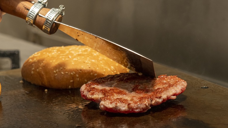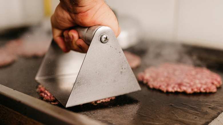A spatula is flat, spacious, and seemingly ideal for making smash burgers. Although it seems logical to use and technically can get the job done, there's a trick to properly smashing burgers. A burger press is a tool made specifically for smashing. Don't confuse it with a tool that presses patties before cooking. You'll be doing the smash as soon as the meat hits the griddle or pan. Unlike spatulas, burger presses for smash burgers come in various sizes and offer suitable surface space. The space ensures that patties are pressed evenly and will be uniformly thick, whereas spatulas usually have a smaller surface that only partially covers the patty. Burger presses are also equipped with a handle made to withstand pressure. There are manual presses, electric ones, and ones made with built-in grills. Materials range from cast iron and stainless steel to non-stick.