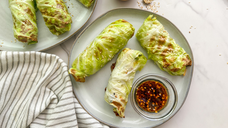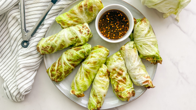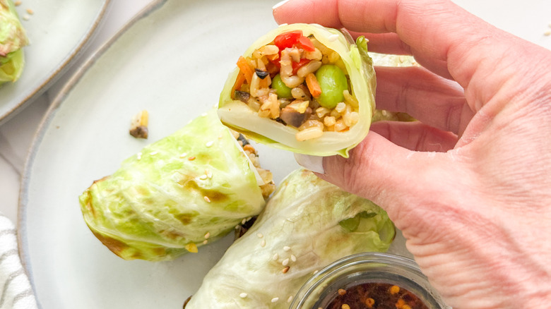 Any meal that can be easily whipped up in an air fryer is a winning one to us. Take, for example, these air fryer veggie-stuffed cabbage rolls; tender cabbage leaves get perfectly cooked in the air fryer until they're deliciously crisp on the edges with a hearty savory filling on the inside. Cabbage has a way of transforming in the air fryer, taking on a charred flavor yet retaining its natural sweetness. The filling is jam-packed with lots of veggies like diced mushrooms, red pepper, carrots, edamame, seasoned to perfection with aromatic spices.