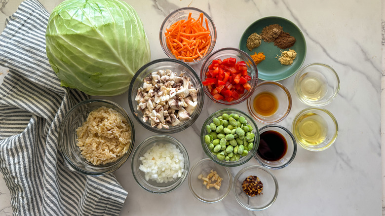 Gather the ingredients for air fryer veggie stuffed cabbage rolls