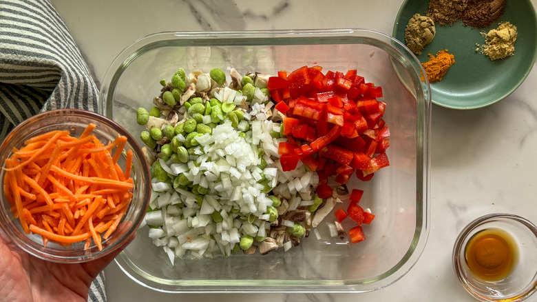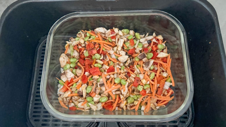 - Add the mushroom, red pepper, carrots, edamame, onion, garlic, 1 teaspoon sesame oil, cumin, coriander, garam masala, ¼ teaspoon ginger, and the turmeric to an oven safe dish that will fit in your air fryer. Stir to combine.