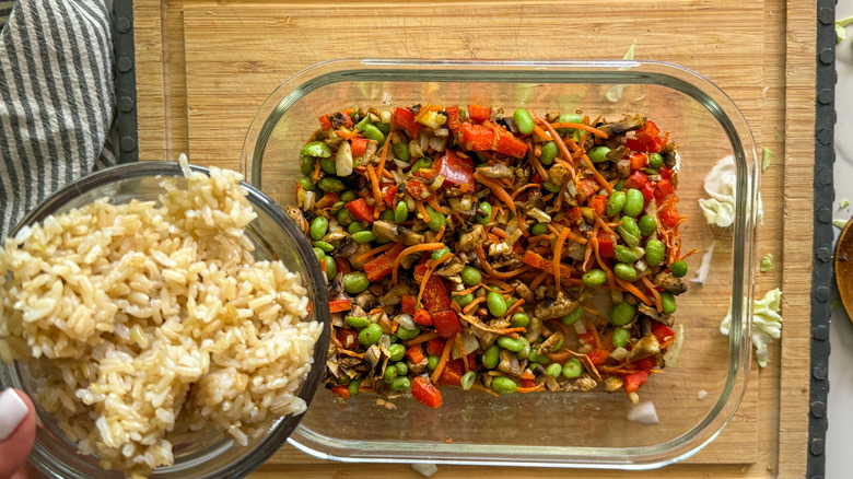 To make this recipe, start in the produce aisle and pick up mushrooms, red pepper, shredded carrots, onion, garlic, and green cabbage. Hit up the frozen aisle for shelled edamame and the dry goods area for some rice of your choice.