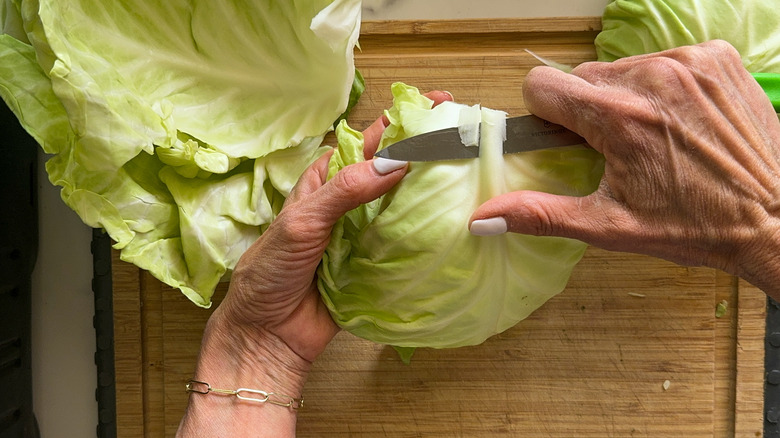 - Cut the core off of the cabbage and peel gently to separate the leaves. You'll need 10-12 leaves.