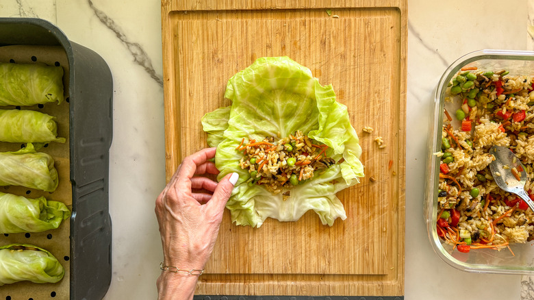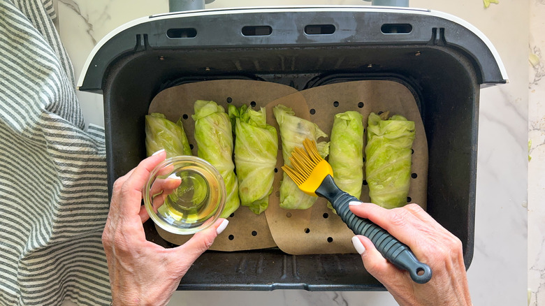 - Fold in the sides of the cabbage and wrap up into a tight roll and place in the air fryer basket. Repeat until you've used up each cabbage leaf and all of the filling.