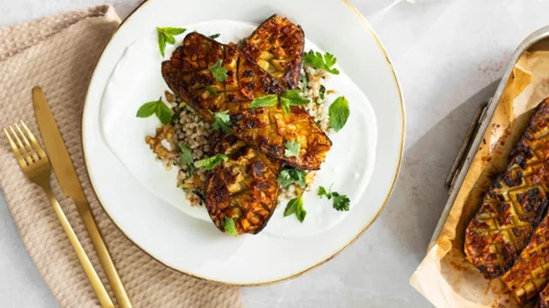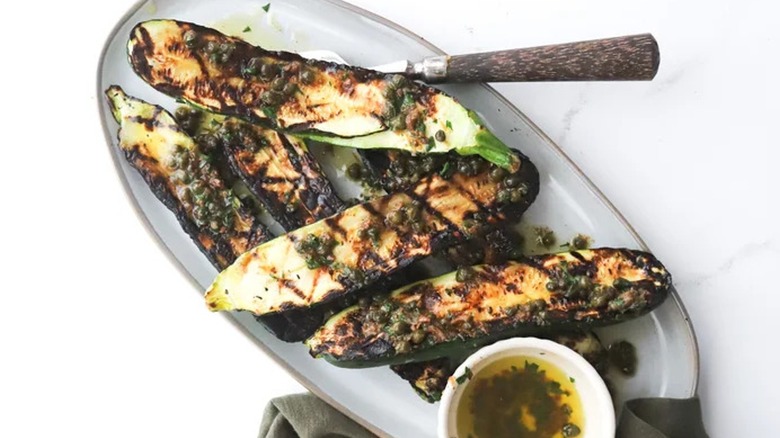 Zucchini is a popular choice for Italian meals, and this recipe created by Taylor Murray is loaded with rich Mediterranean flavor. The halved zucchini only needs to be grilled to impart that tasty browning, with most of the taste coming from an easy but intense mix of capers, anchovies, garlic, lemon zest, and olive oil. The sauce gets cooked separately, infusing the oil with flavor and deepening the taste of the bright capers and salty anchovies before it gets drizzled over the finished zucchini. The result is a dish that's rich with umami and pops with briny tang.