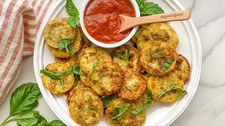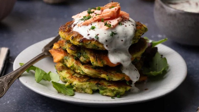 If you still need more proof that zucchini can go with anything and taste good, try this recipe developed by Tasting Table's Jennine Rye that pairs it with rich and salty smoked trout. The zucchini provides a light base to the fritter, with some extra flavor from fresh chives and dill. The mild, bright taste is a great backbone for the pops of strong seafood flavor that you get from the chopped-up smoked trout, which is mixed directly into the fritter. These cakes can be whipped up in a matter of minutes, and, topped with a yogurt sauce and a little more trout, they can even serve as a light meal.