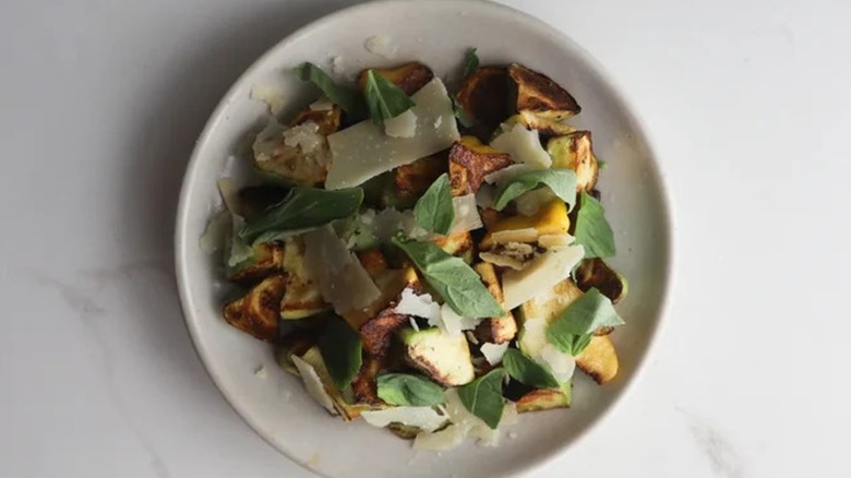 Summer squash may be mild in flavor, but that doesn't mean that you need to do a lot of work to dress it up. This recipe created by Taylor Murray uses pattypan squash — those little disc-shaped squash you might find at a summer farmer's market — and turns it into an easy 15-minute side dish. The quartered squash has a perfect soft, meaty texture after a short sauté in olive oil, and then all it needs is some lemon juice and Parmesan along with salt and pepper to beef up its taste a bit. It's the perfect showcase for how squash can take simple flavors up to the next level.
