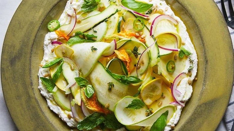Shaved squash and creamy cheese are a perfect pairing, marrying light crunch and satisfying richness. This unique salad piles strings of thinly sliced summer squash over whipped ricotta that's been boosted with lemon zest and slightly sweetened by honey. The squash itself gets doused in punchy summer flavors from the added mint, basil, serrano chile, and lemon juice for a well-balanced mix of acidic bite that counters the creamy sweetness of the whipped cheese. It's a sunny, cooling salad that tastes as bright as the season itself.