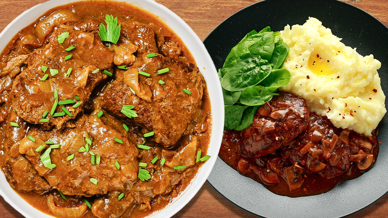 Although both recipes have "steak" in their names, only cube steak qualifies as the usual definition of steak — an actual slice of meat. The steak in a Salisbury recipe is formed from ground beef instead, which is seasoned, seared, and shaped into a steak-like patty. Gravy figures into the equation for serving both of these steaks, partly for adding flavor, and partly for contributing moisture. A good sauce is worth the effort, and these recipes are proof.