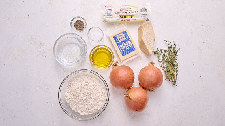 To caramelize onions, you'll just need a few large yellow onions, olive oil, and salt. Keep the olive oil and salt handy to make the base of the flatbread, for which you'll also need flour and water. The remaining ingredients are just cheese, herbs, and seasonings — grab Gruyère, Parmesan, and mozzarella, and shred them fresh for better, meltier results. Then, grab a few sprigs of fresh thyme and some cracked black pepper to complete the flatbread.