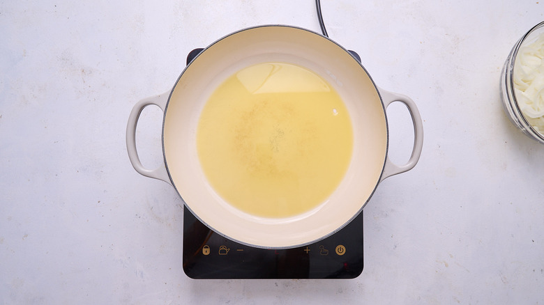 First, slice your onions as thinly as possible so that they cook faster in the pan. A properly caramelized onion will release its own moisture, not needing much more than the initial few tablespoons of fat. Adding salt at the beginning helps to draw moisture out and to brown the onions faster. But it's important to be patient. Turn the heat to low — or at most, medium-low — and stir occasionally. Don't be tempted to add more oil unless the onions begin burning, in which case your heat is too high and needs to be turned down immediately. There's no quick way to cook great caramelized onions — if you cook them on a higher heat, you won't initiate the Maillard reaction, and you'll get a browned and possibly bitter onion instead. Who knew one vegetable could be so complicated?