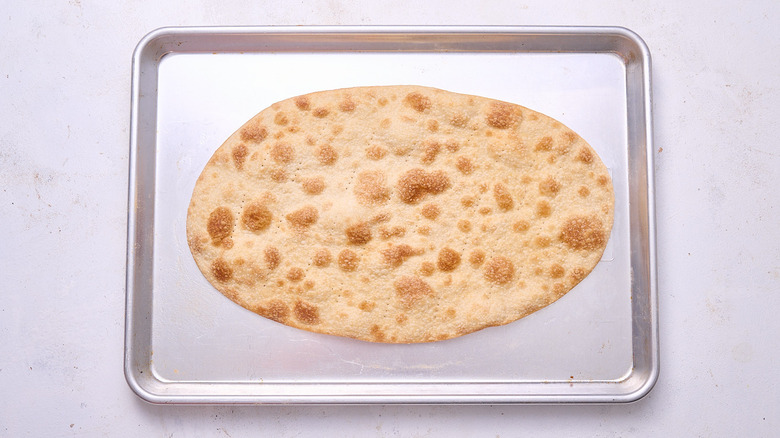 Flatbread isn't your standard pizza. Usually lighter in toppings and ovular in shape, flatbreads are like pizza's fancy cousin. As the name implies, because most flatbread recipes don't call for yeast the crust is completely flat. Without the yeast, the crust crisps like a cracker, leaving only a hint of the doughy, chewy quality we know in pizza. The blueprint from there is generally the same: A little bit of sauce, some cheese, a collection of toppings, and maybe a hint of seasoning. We've come to expect certain standard toppings for pizza, but flatbread is less hampered by expectations, so you can experiment with different combinations of flavor.