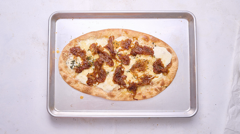 This recipe is simple but precise, meant to replicate the familiar flavors of a warming French onion soup. Because of its simplicity, though, it's highly customizable, and it's easy to add, change, or omit toppings to customize this flatbread. The cheese, for example, can be swapped for other varieties, though we recommend sticking with soft white cheeses. Fontina is a great option to replace Gruyére. For a similar tang, you can also replace the Gruyére with Swiss. For a more peppery flavor, replace the Parmesan with Romano.