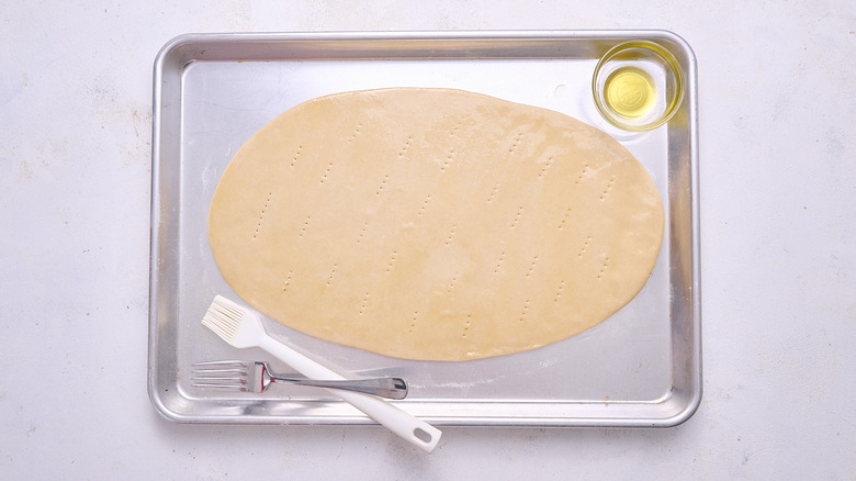 - Transfer the crust to a baking sheet, prick it with a fork, then brush it with a thin layer of olive oil.