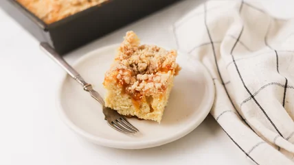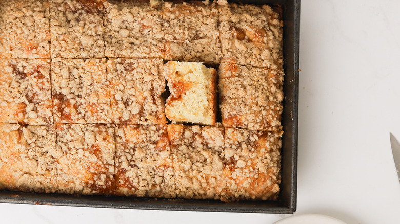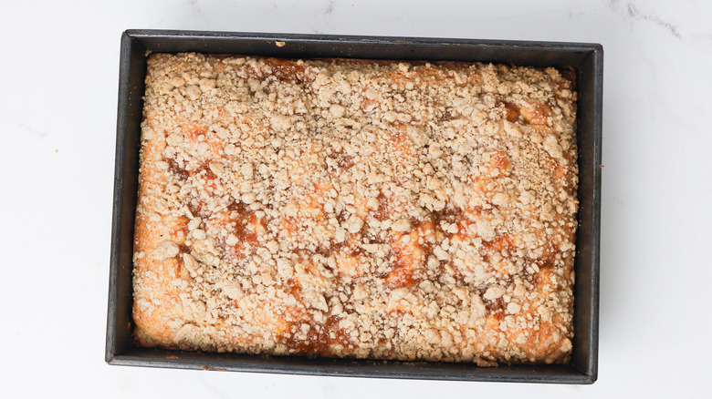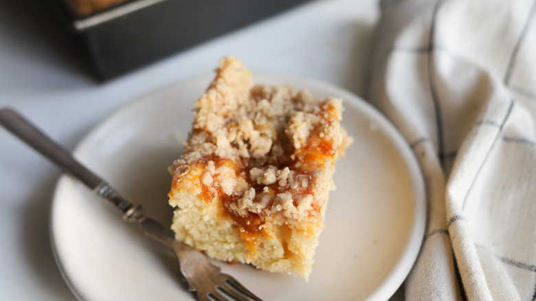 Cake for breakfast. Need we say more? Coffee cake is a sweet baked treat that's designed to pair well with a bracingly hot cup of strong coffee. For those who prefer a taste of something sweet in the morning, this cinnamony, buttery cake always hits the spot. Famously versatile, coffee cake can be adapted to a variety of occasions with simple additions or substitutions. In this recipe, we add sweet and tart peach jam, which bakes into the cake and leaves gooey pockets of fruit flavor. It's a unique twist on the classic recipe that doesn't require much extra effort. With the addition of a simple jar of jam, you can add a level of fruity complexity to a standard coffee cake recipe to create an easy and delicious baked good that's ready in no time at all.