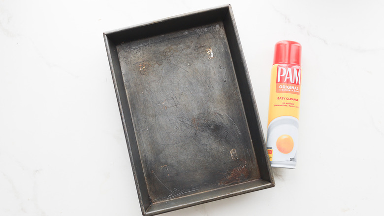 - Prepare a 9x13-inch baking pan by coating with nonstick spray.