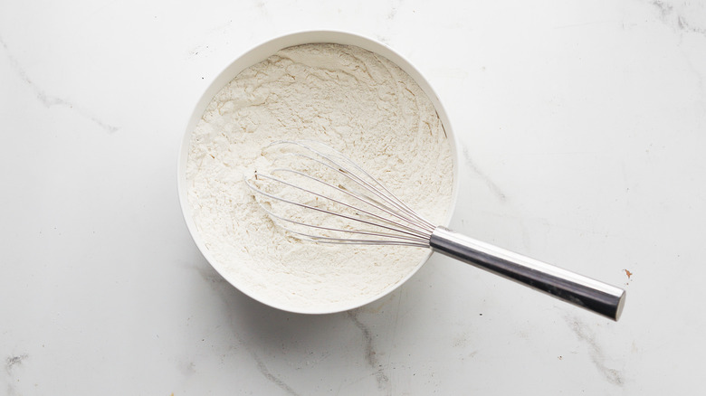 - In a large bowl, whisk together 3 cups of flour, baking powder, baking soda, and salt. Set aside.