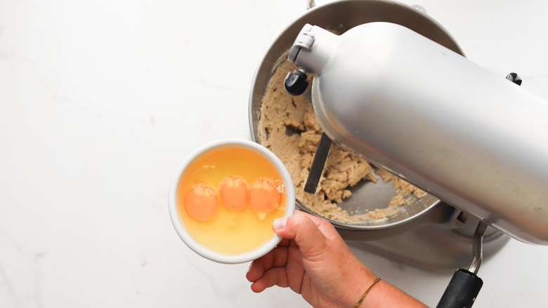 - Add the eggs one at a time, scraping the bowl after each addition, and mix until fully incorporated.