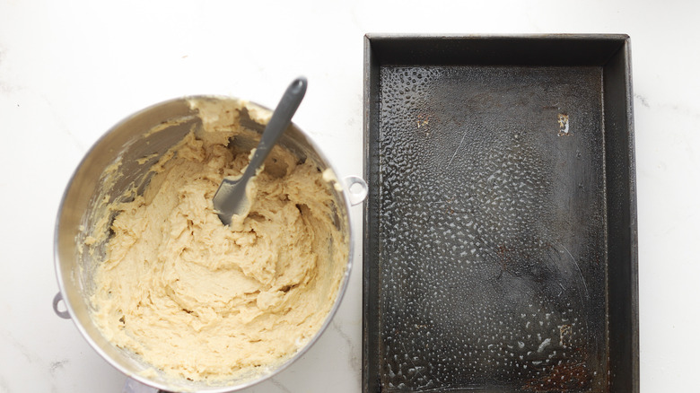 - Transfer the batter to the prepared baking pan, spreading to smooth the top.