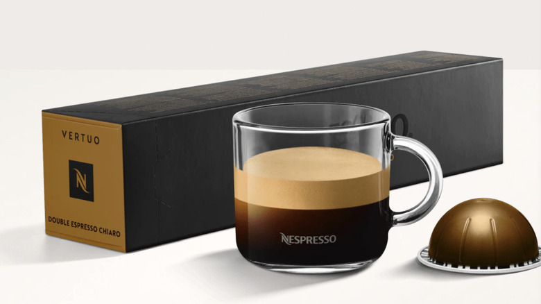 A double shot of espresso, also known as doppio, the Italian word for "double," refers to two shots of espresso rather than a single shot. In a Nespresso pod, that means double the amount of ground coffee and double the amount of water. Instead of using standard 1.35-ounce espresso pods, you'll be popping in a 2.7-ounce double espresso pod. At present, the Vertuo line offers three double espresso blends, each with its own unique characteristics.
