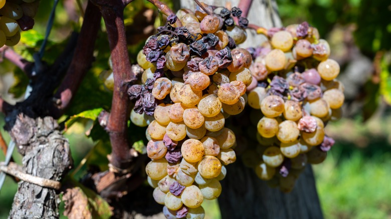 Sauternes is both the wine region in the southeast of Burgundy, France and the wine itself. A sweet wine, Sauternes stands apart thanks to the unique aromatics and flavors developed from Noble Rot. While Noble Rot doesn't exactly sound like a good thing, it's a very specific and desired fungus (botrytis cinerea) that can be achieved in the right conditions. Infecting various bunches throughout the vineyard, the fungus dehydrates the grapes, concentrating fruit flavors, and sugars, imparting an earthy nuttiness to the finished wine.