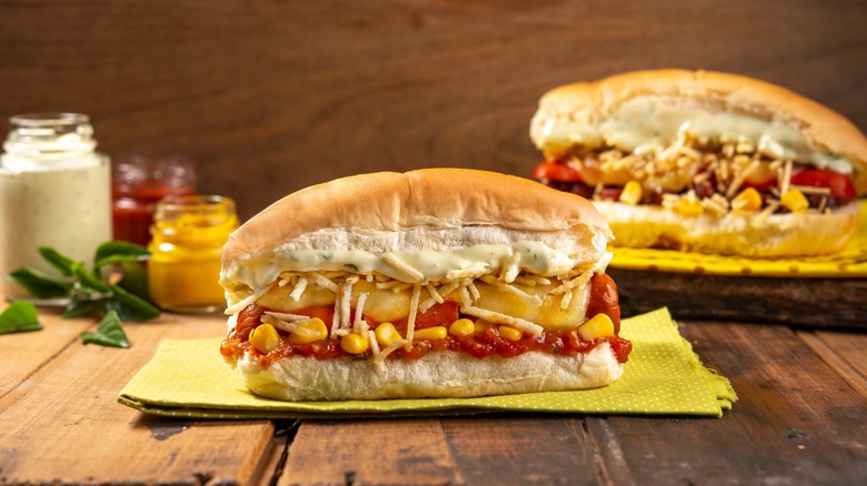 A lot of people might consider hot dogs an all-American food. However, many folks around the world would take issue with that, especially in sausage-centric European societies. Regardless, Americans can at least lay claim to Coney Island dogs wrapped in a long steamed bun and piled high with white onions, chili, and lots of mustard. Putting pride aside, however, opens some stunning possibilities for hot-dog nirvana. Specifically, there's a thing called Brazilian-style hot dogs featuring toppings you might not have never imagined.