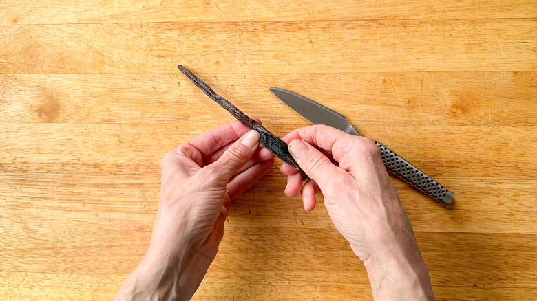 Split the vanilla bean lengthwise to expose the seeds.
