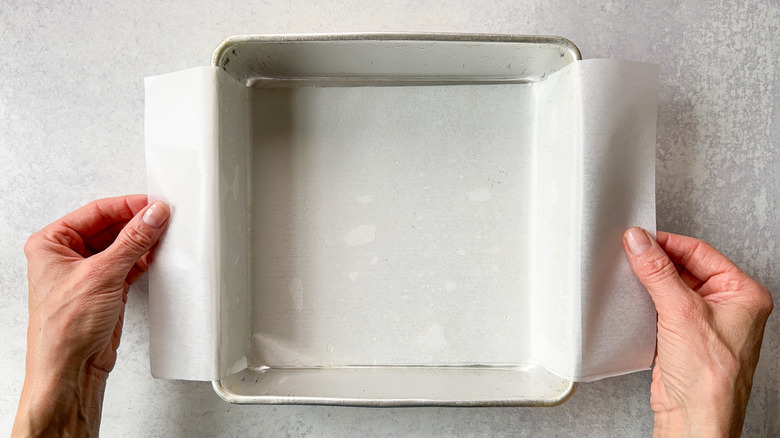 - Grease and line an 8-inch square baking pan with parchment, leaving a 1-inch overhang on 2 sides.