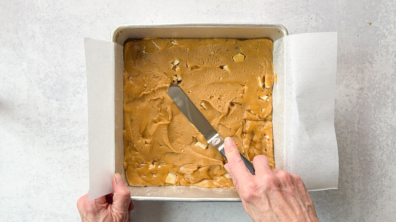 Transfer the blondie batter to the prepared pan and smooth the top.