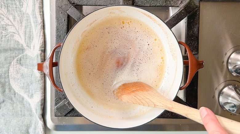 Once the butter starts to foam, reduce the heat slightly and cook and stir for about 5 minutes until it reaches a deep golden brown color.
