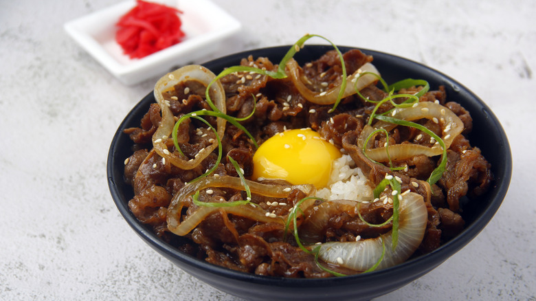 Gyudon originates from a beef hot pot known as gyunabe, which became very popular during the Meiji era, at the very beginning of Japan's love affair with beef. Gyunabe was made of beef and onions, stewed in a miso paste broth. People began to pour their leftover broth over rice, and restaurants spotted this combination as a cheaper alternative to the original dish — and gyudon was born.
