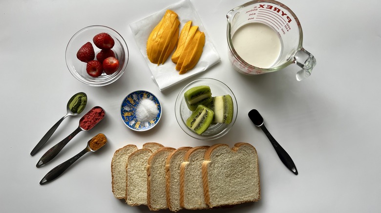 For the sandwich filling, you'll need whipping cream, sugar, and vanilla extract, plus some matcha powder, turmeric, and ground freeze-dried strawberries to color it. The fruits Le Moing uses for this sandwich trio are mangos (you'll need one), kiwis (one or two, depending on size), and strawberries. If you want to make the sandwiches as traditionally as possible, Japanese milk bread is ideal. You can easily find it at most bakeries and grocery stores. If you can't find any, you can substitute with brioche or your favorite fluffy white bread, just make sure the sandwich slices are square, not rectangular so can fit in more fruit.