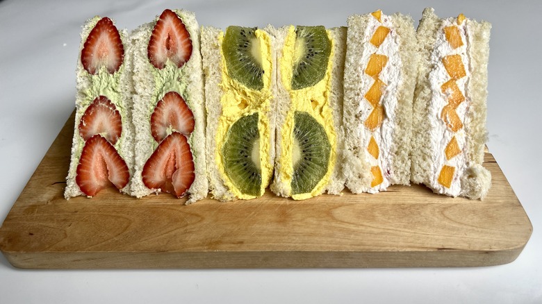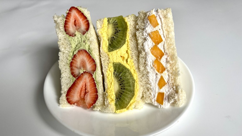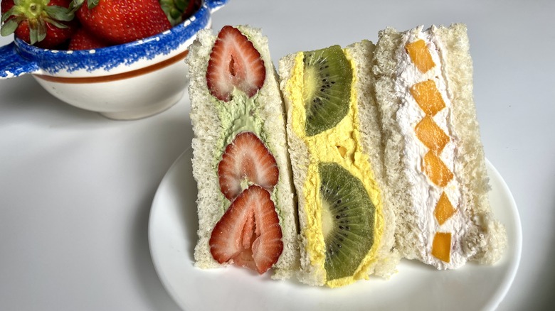 In recent years it's become quite trendy to use savory ingredients to elevate desserts — stirring bacon bits into peanut butter cookies, for example, or herbs into sugar cookie dough — but one Japanese dish goes in the opposite direction. Japanese fruit sandwiches turn a traditionally savory dish into a sweet one by using fruit and whipped cream as a filling. As pretty as they are delicious, these special dessert sandwiches combine bright juicy colors and flavors with subtly-colored whipped cream. As recipe developer Tess Le Moing says of them, "The taste of these sandwiches ticks every box. The bread is fluffy and the whipped cream is light and barely sweetened so the juicy, sweet flavor of the fruit shines."