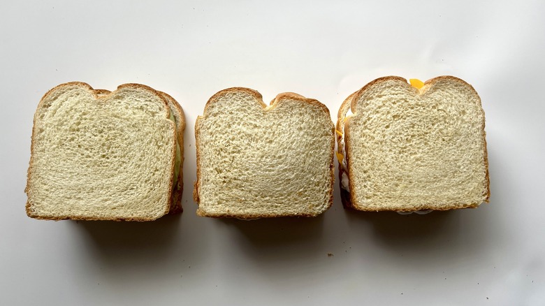 - Unwrap the sandwiches and slice off the crusts with a serrated knife.