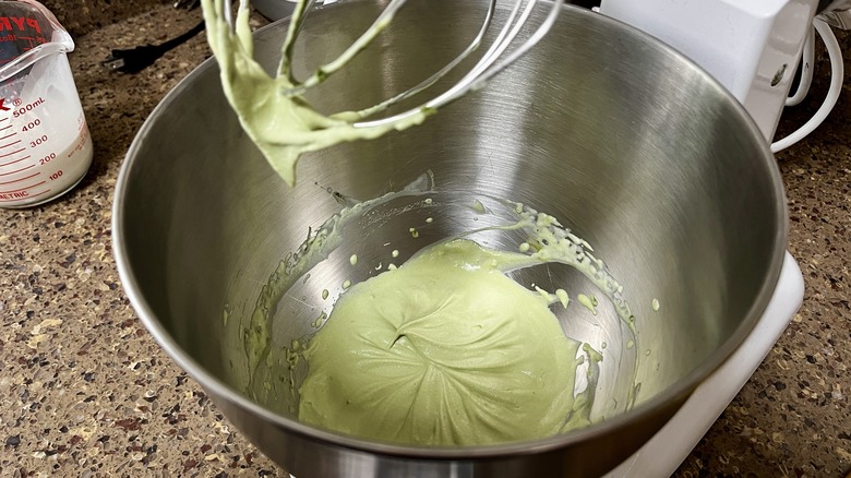 - Transfer the green whipped cream to a bowl, then clean the bowl of the stand mixer.