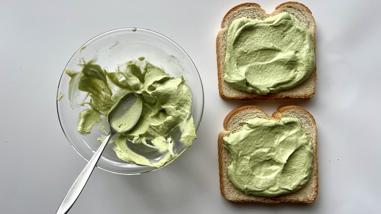 - Dollop and evenly spread about ¼ cup of matcha whipped cream on two slices of bread.