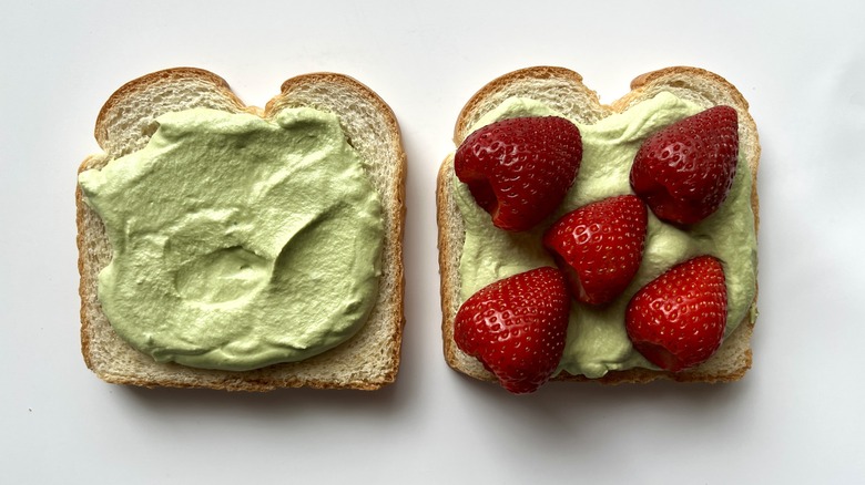 - Place 3 strawberries along the center diagonal of one slice of bread with the matcha whipped cream, and 2 strawberries in the remaining spaces.