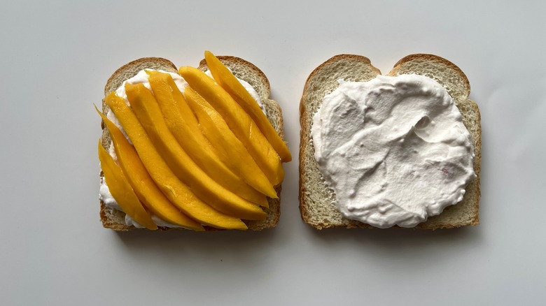 Shingle the mango slices along the center diagonal of one slice of bread with pink whipped cream.