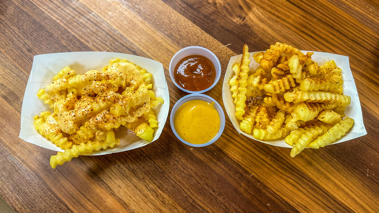 The cheese sauce is a decadent, tasty topping for the fries, but in this case, it's not needed. The BBQ seasoning is reminiscent of a really good steak flavoring, loaded with savory, smoky taste with added depth from the dried chipotle. This seasoning does a lot of heavy lifting when it comes to adding flavor to the fries, especially if you pair them with the Carolina BBQ sauce. If you're a cheese-topped-fry enthusiast, go forth and cheese away, but with the deep, rich flavor of the seasoning and the brightness of the sauce, the cheese doesn't add anything in terms of flavor.