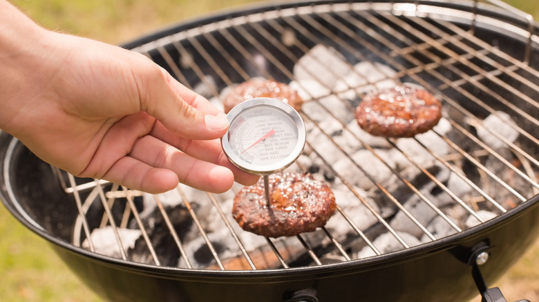 Thus, it is important to properly gauge the internal temperature of your turkey burger before you take it off the heat. This is one of the real reasons you actually need a meat thermometer, which is a tool every cook should have. The temperature you should aim for with this type of meat is 165 degrees Fahrenheit, per the USDA. That comes with a caveat, though.