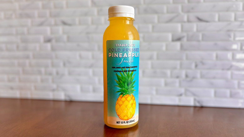 Is there anything better than a scrumptious, ripe, juicy pineapple? If your answer to that question is no, then Trader Joe's cold-pressed pineapple juice is exactly what you want to reach for on your next shopping trip. This is a bottle of pure tropical goodness — much like with the grapefruit juice, it tastes about as fresh as juice can get, and that alone makes this a worthy contender among some less-than-fresh options.