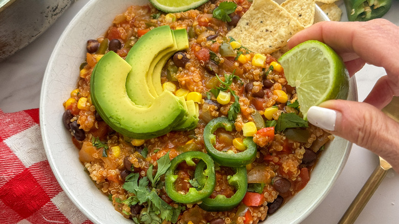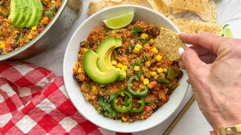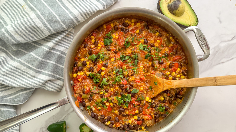 Wellness coach and recipe developer Miriam Hahn brings us this recipe and says, "Mexican food is always a hit at my house and I typically have all of these ingredients on hand so can create this meal at a moment's notice. I like to put out small bowls with toppings so everyone can add what they love to their bowl or burrito." Think toppings like avocado slices, sliced jalapeños, lime wedges, and sour cream, and perhaps some tortilla chips to scoop it all up.