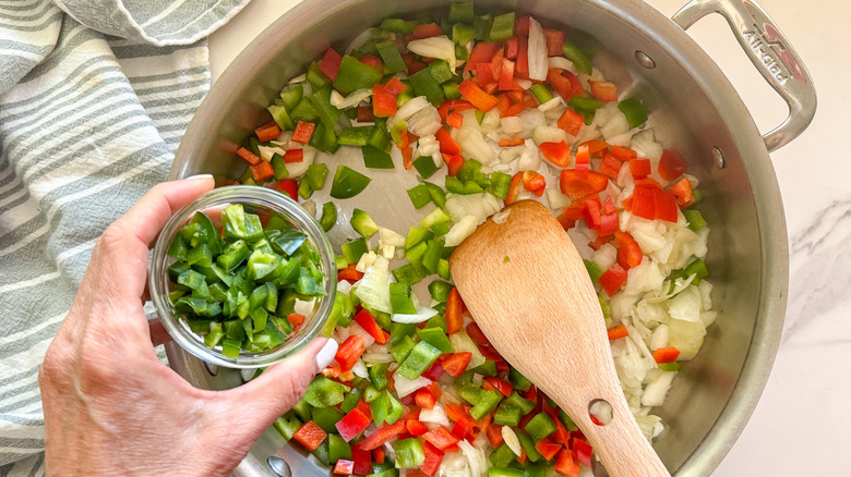 - Saute the onion, garlic, bell peppers, and jalapeño for 8 minutes, stirring frequently.