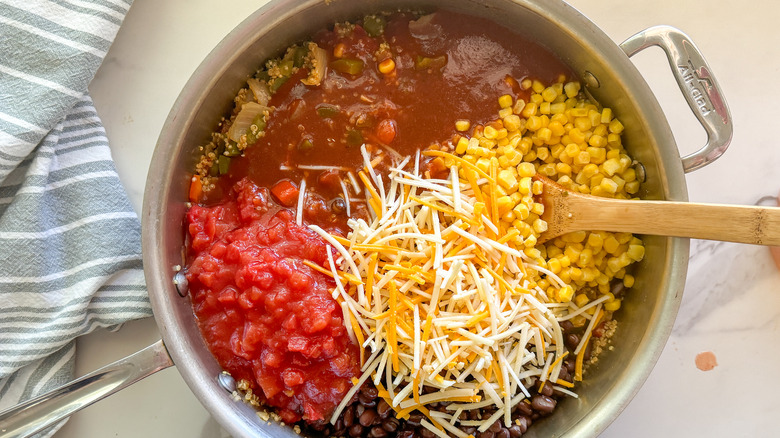- Mix in the enchilada sauce, diced tomatoes, black beans, corn, lime juice, and cheese. Cook for 5 minutes on medium-low heat.