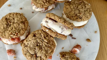 A treat for adults and kids alike, soft, chewy oatmeal cookies are the perfect complement to roasted ripe summer peaches, vanilla ice cream, and a sprinkling of cinnamon chips. Serve them at your next barbecue or get-together, or just keep them stocked away in the freezer for the perfect movie night snack. Recipe developer Katie Rosenhouse tells us, "These ice cream sandwiches are everything you want them to be: Soft enough to bite through without making a mess, the perfect balance of sweet and tangy, and a nice contrast of luscious vanilla ice cream and crisp pecans. They're just delicious."