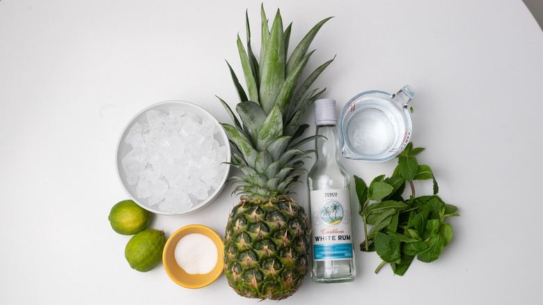 To make this mojito, you will need a small pineapple, lime juice, fresh mint, granulated sugar, white rum, crushed ice, and soda water. To garnish the cocktail, you may additionally want to use pineapple leaves, so think twice before discarding the stem.